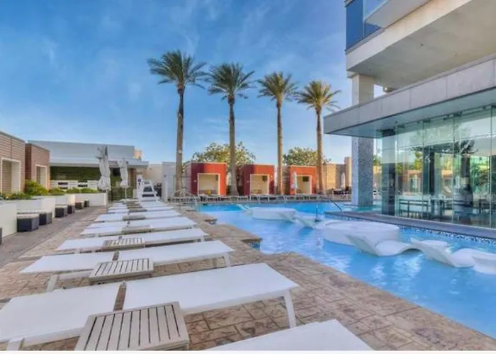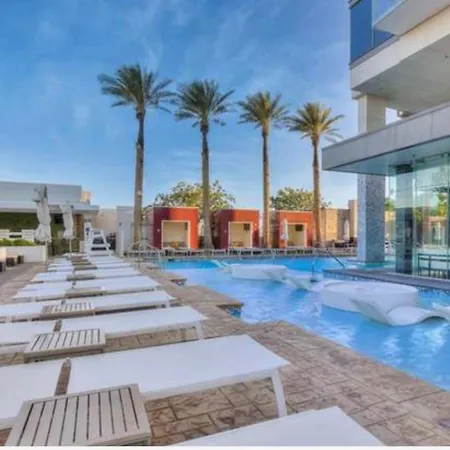 ベッドルーム1室のLuxe Condo Balcony Strip View No Resort Fee ラスベガス ヴィラはLast Chance Tattooから徒歩でわずか5分に位置し、屋内プールやテラスがあり、リラックスした滞在ができる。 駐車場を備えたこの別荘は、Treasure Island Hotel Las Vegasから3km離れた所の場所にあります。